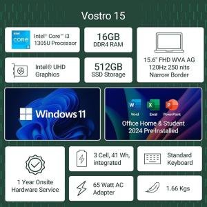 Dell 15, Intel Core i3 13th Gen -1305U, 16GB DDR4, 512GB SSD, FHD, 15.6"/39.6cm, Windows 11, Office H&S 2024, Carbon Grey, 1.66Kg, [Vostro 3530], Intel UHD Graphics, Narrow Border, Thin & Light Laptop