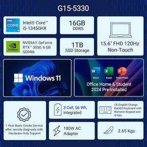Dell SmartChoice G15-5530, Intel Core i5 13th Gen-13450HX, NVIDIA RTX 3050-6GB, 16GB RAM, 1TB SSD, FHD, 15.6"/39.62cm, 120Hz, Windows 11, MS Office 24, Dark Shadow Grey, 2.65Kg, Gaming Laptop